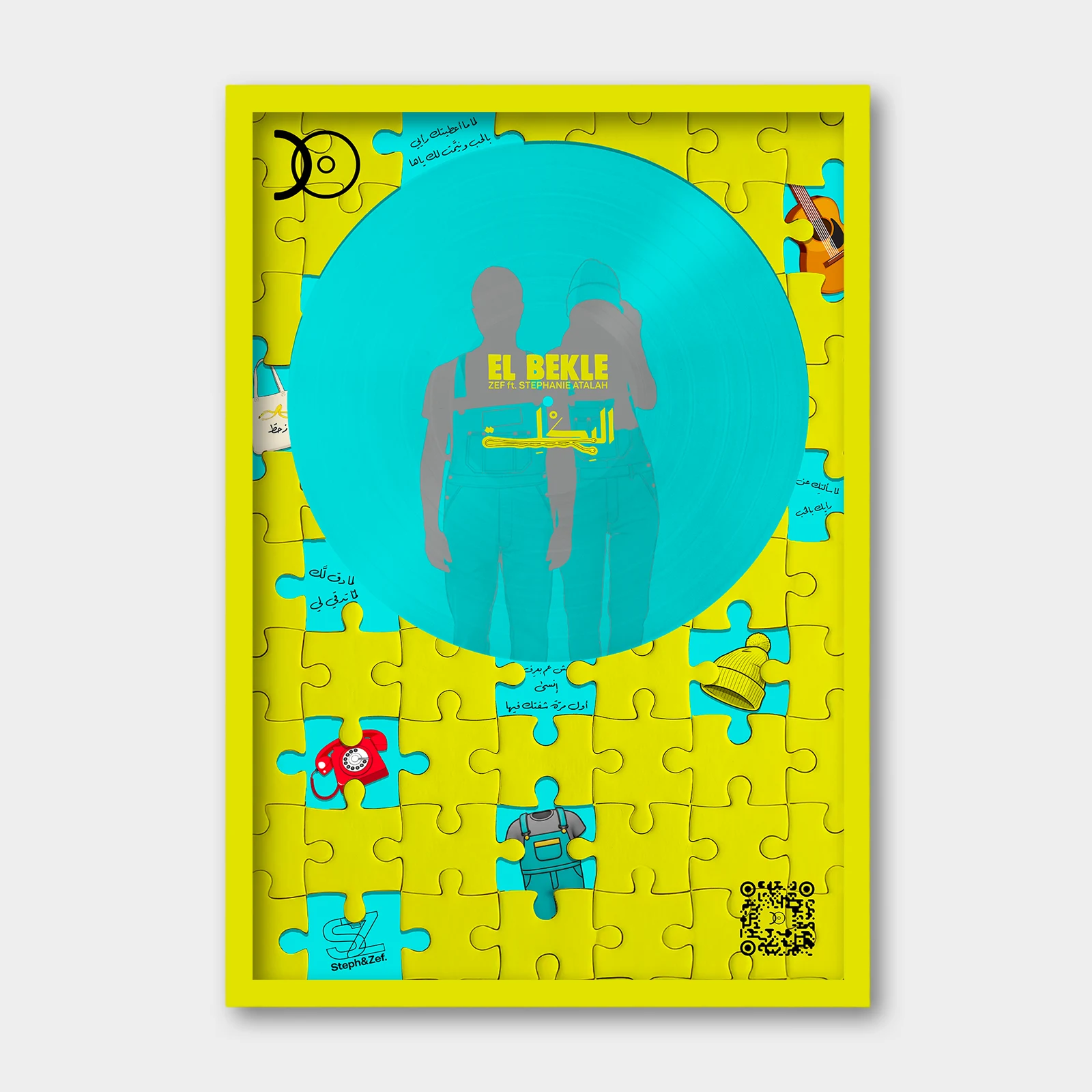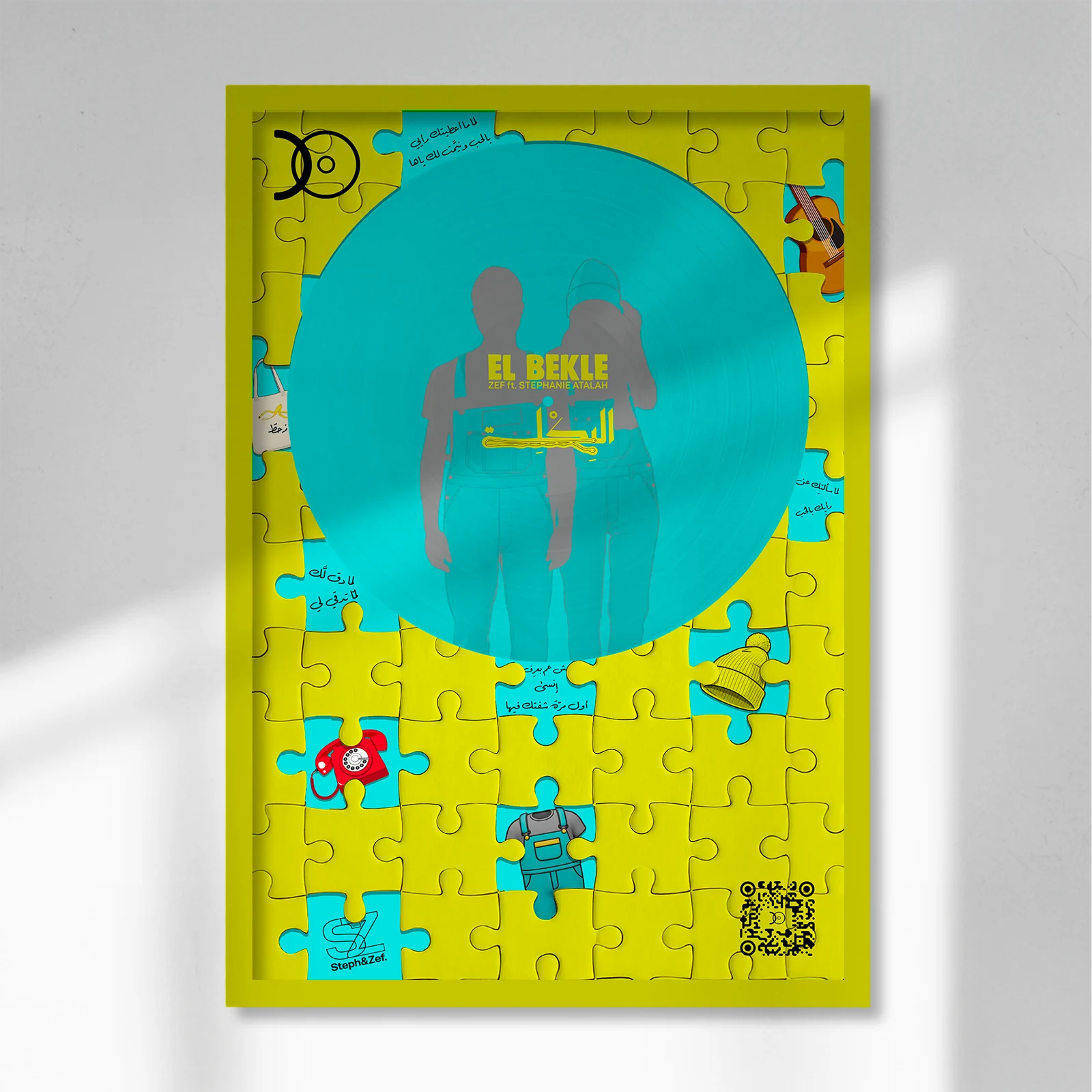 Each frame includes a discreet QR code linking directly to the full album on streaming platforms — merging physical art with digital sound.
