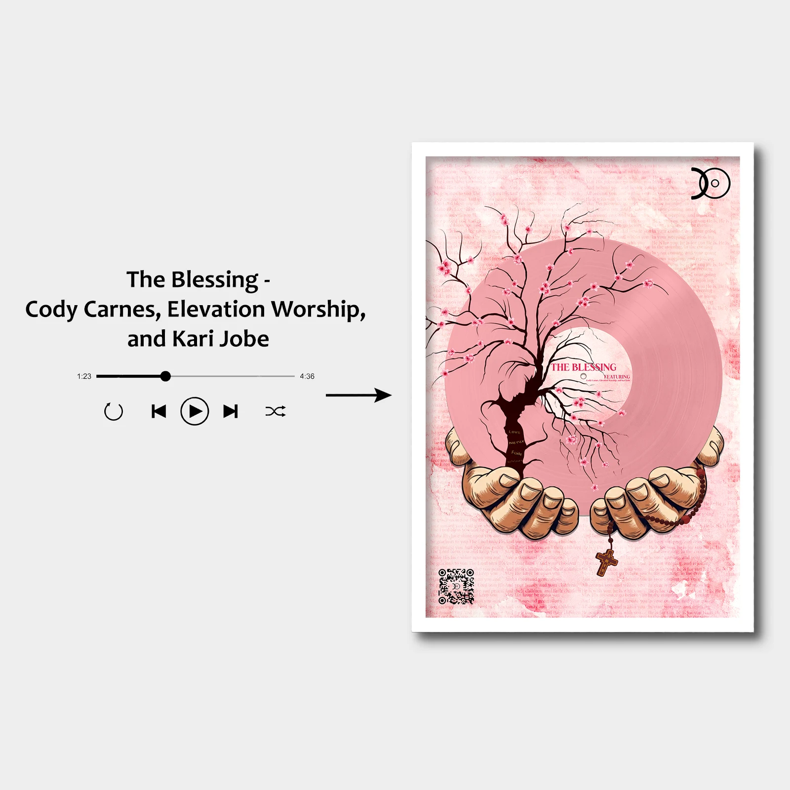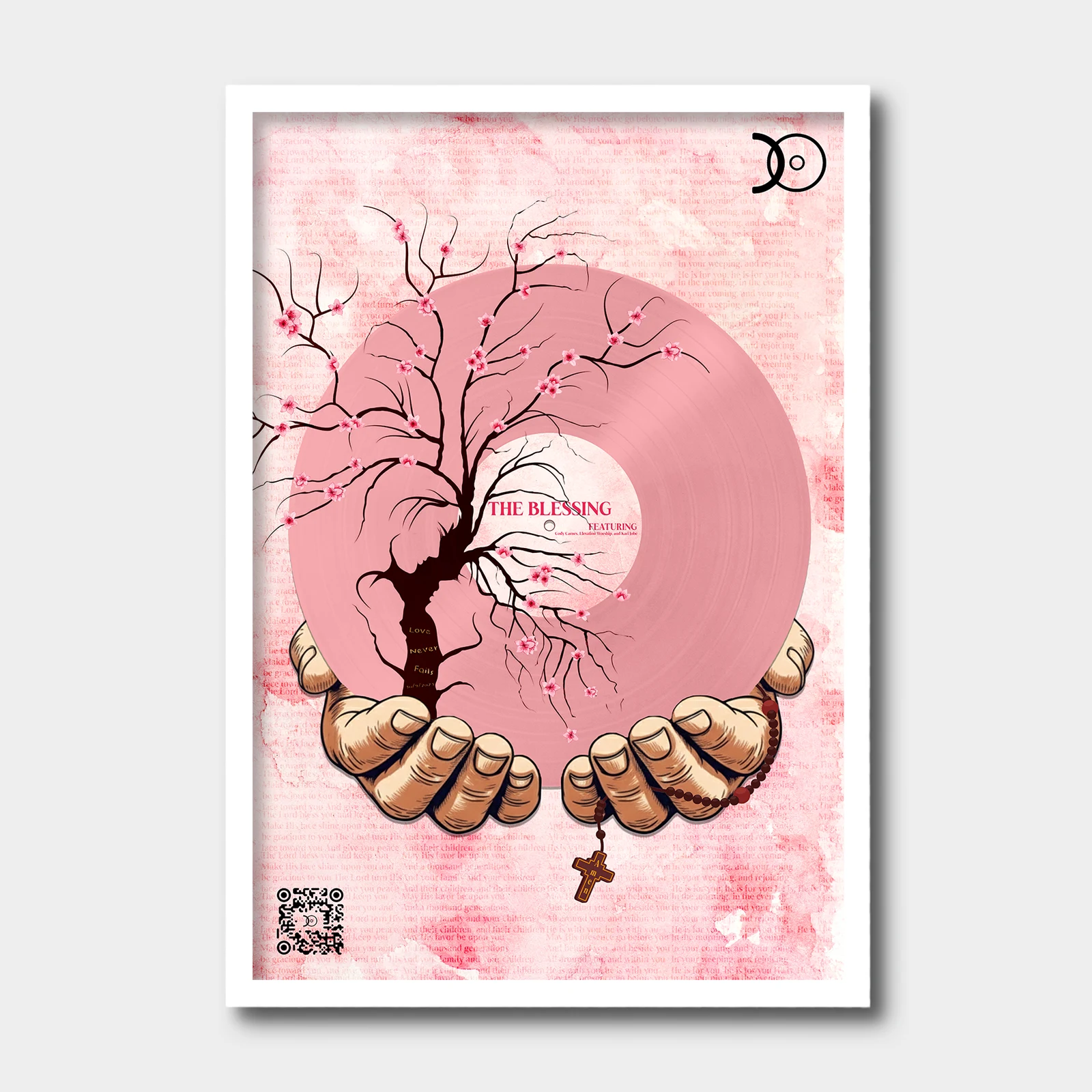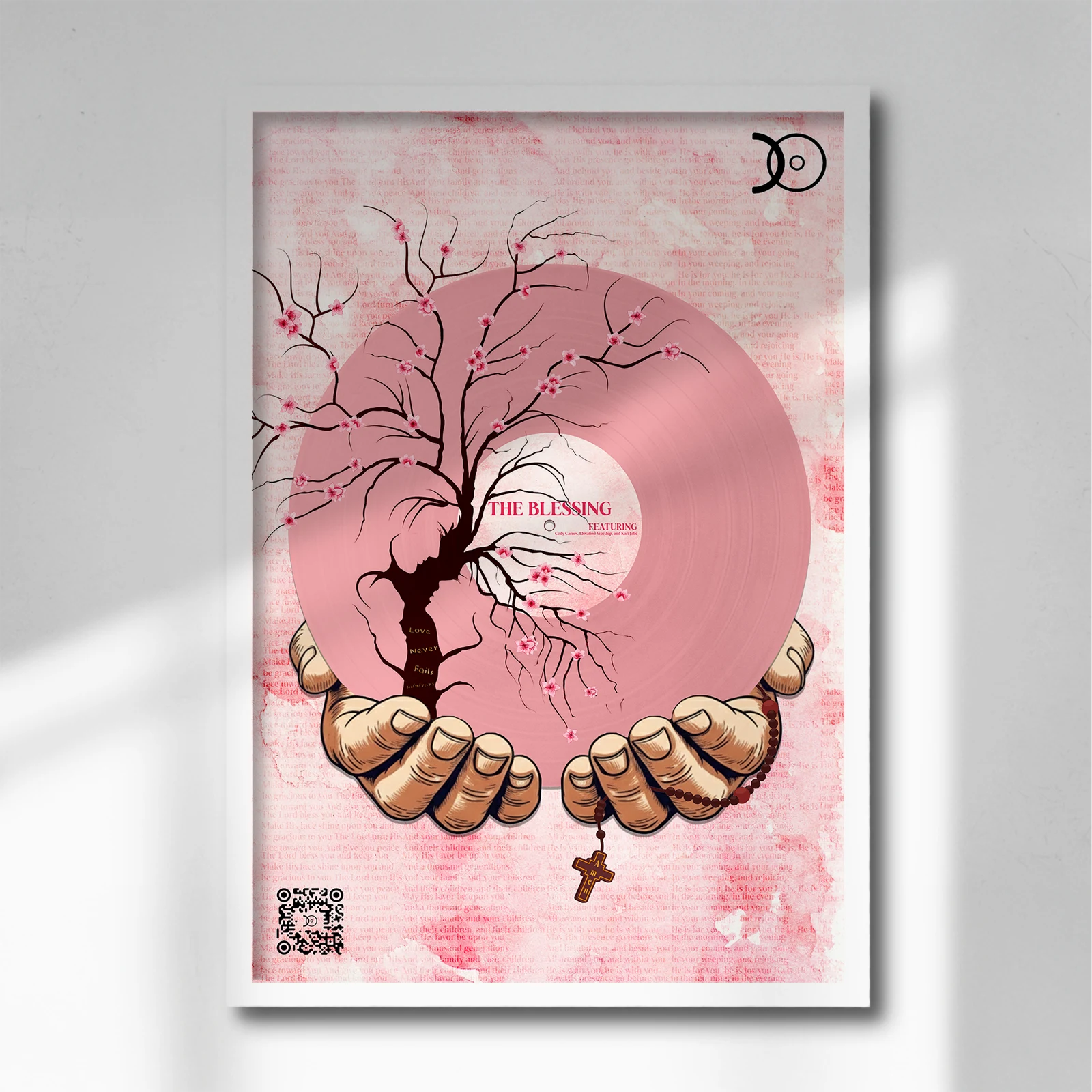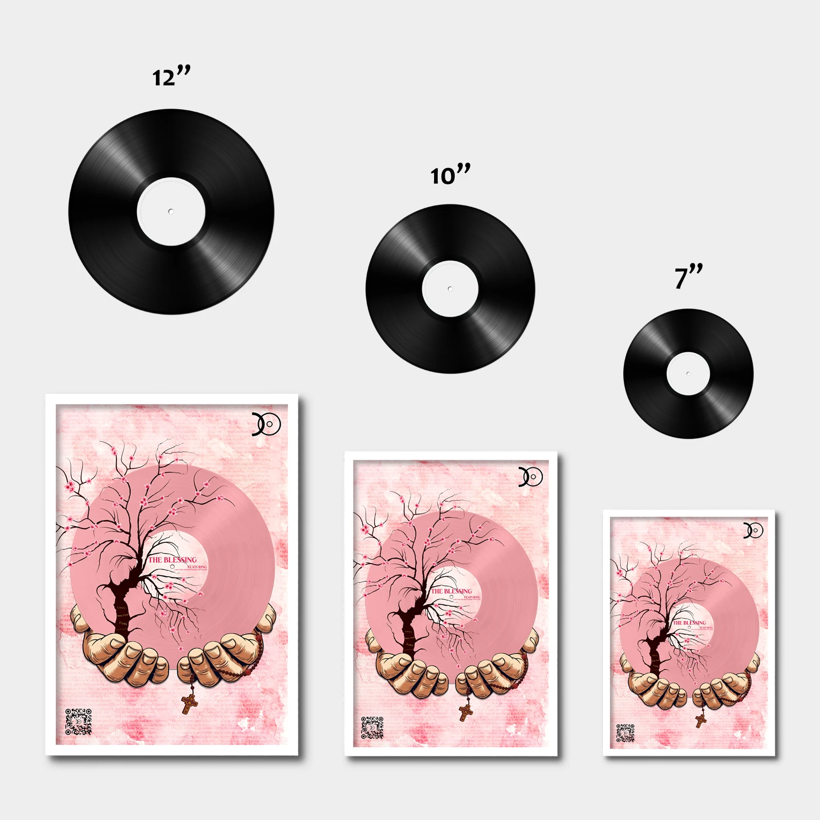 Each frame includes a discreet QR code linking directly to the full album on streaming platforms — merging physical art with digital sound.